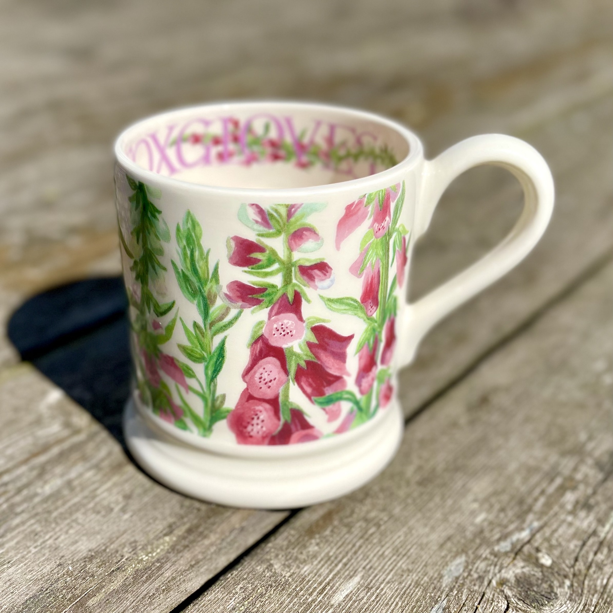 Porslinsmugg av absolut högsta kvalitet i design av Emma Bridgewater. Mönster ?Foxgloves?, som digitalis/fingerborgsblomma heter på engelska. NOS (New Old Stock) innebär att koppen är ny och oanvänd men tillhör en kollektion som utgått. Höjd 9,5 cm.