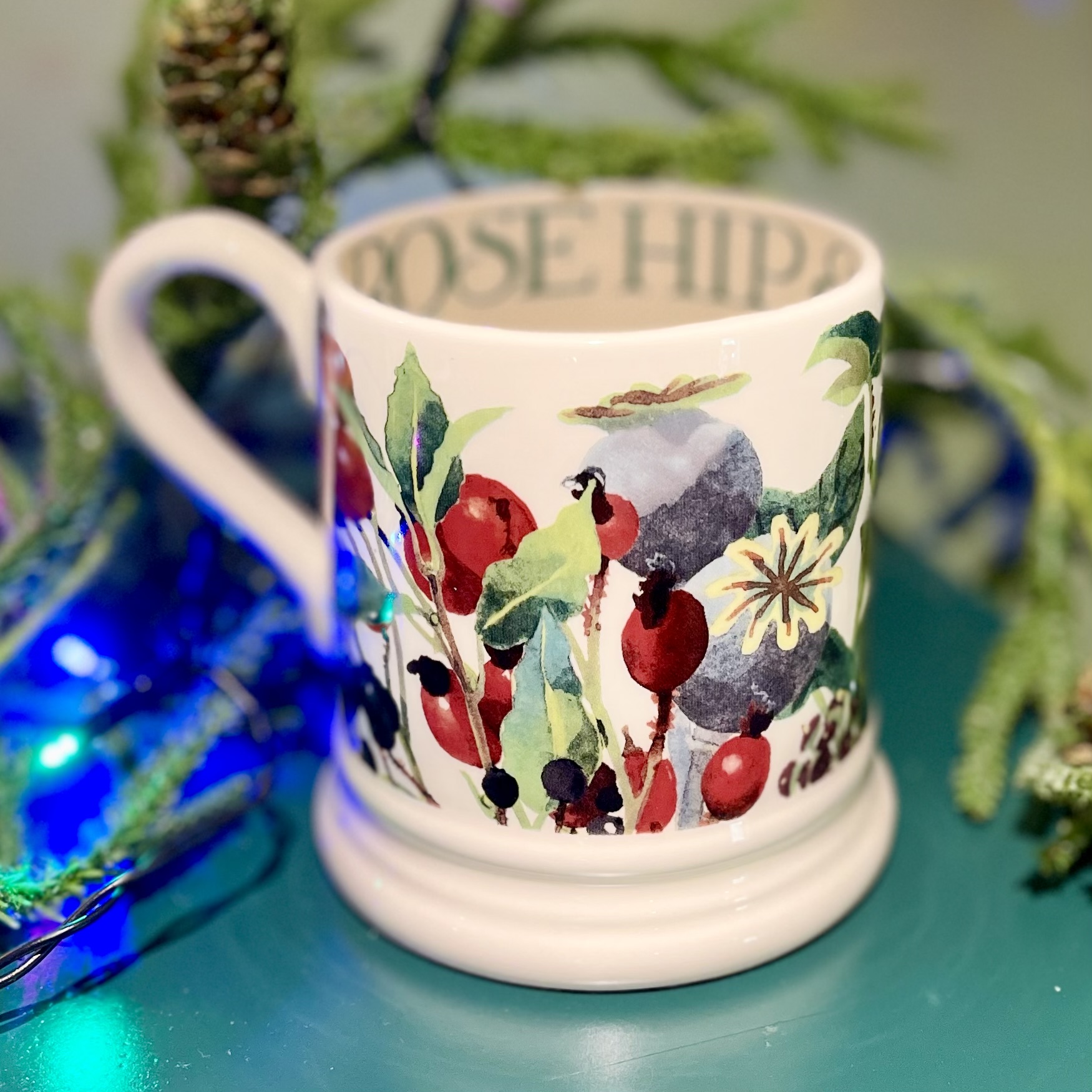En alldeles underbar porslinsmugg av absolut högsta kvalitet i design av Emma Bridgewater. Mönster ?Rosehip & Holly?. NOS (New Old Stock) innebär att koppen är ny och oanvänd men tillhör en kollektion som utgått. Höjd 9,5 cm.