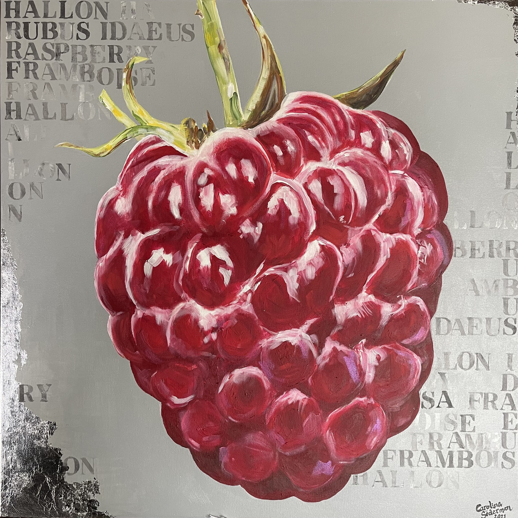 För hallonälskaren! Originalmålning av Carolina Söderman, i akryl på canvas. Innehåller inslag av slagmetall i silver som med rätt ljussättning blir mycket effektfull. Själva canvasen har ett djup på 3,5 cm där kanten är målad, så tavlan kan hängas upp direkt.