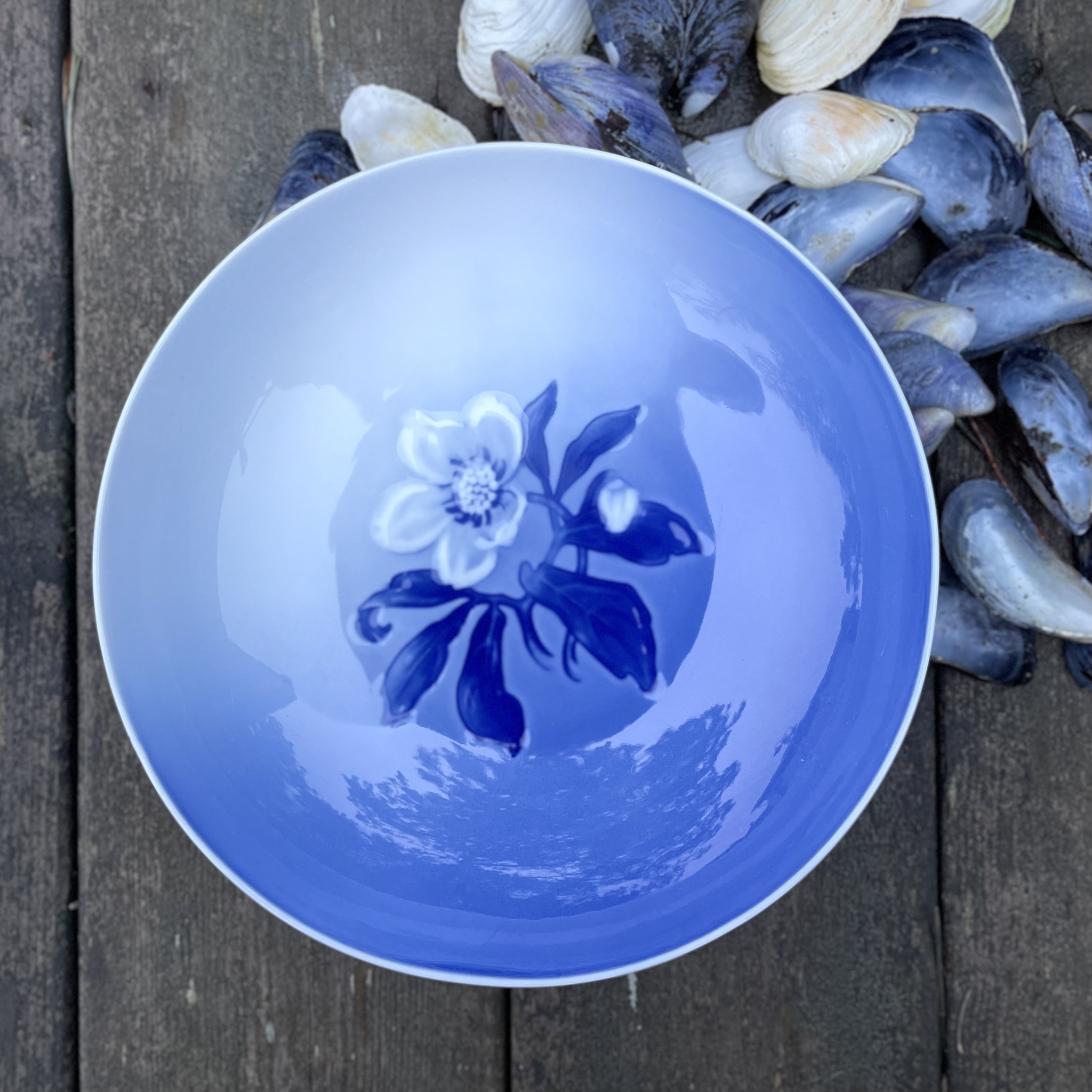 Serveringsskål från Bing & Grøndals serie “Julrosen”, från 1936. Obetydligt bruksslitage. Diameter 20 cm, höjd 5 cm. Design: Louise Cecilie Hallin.