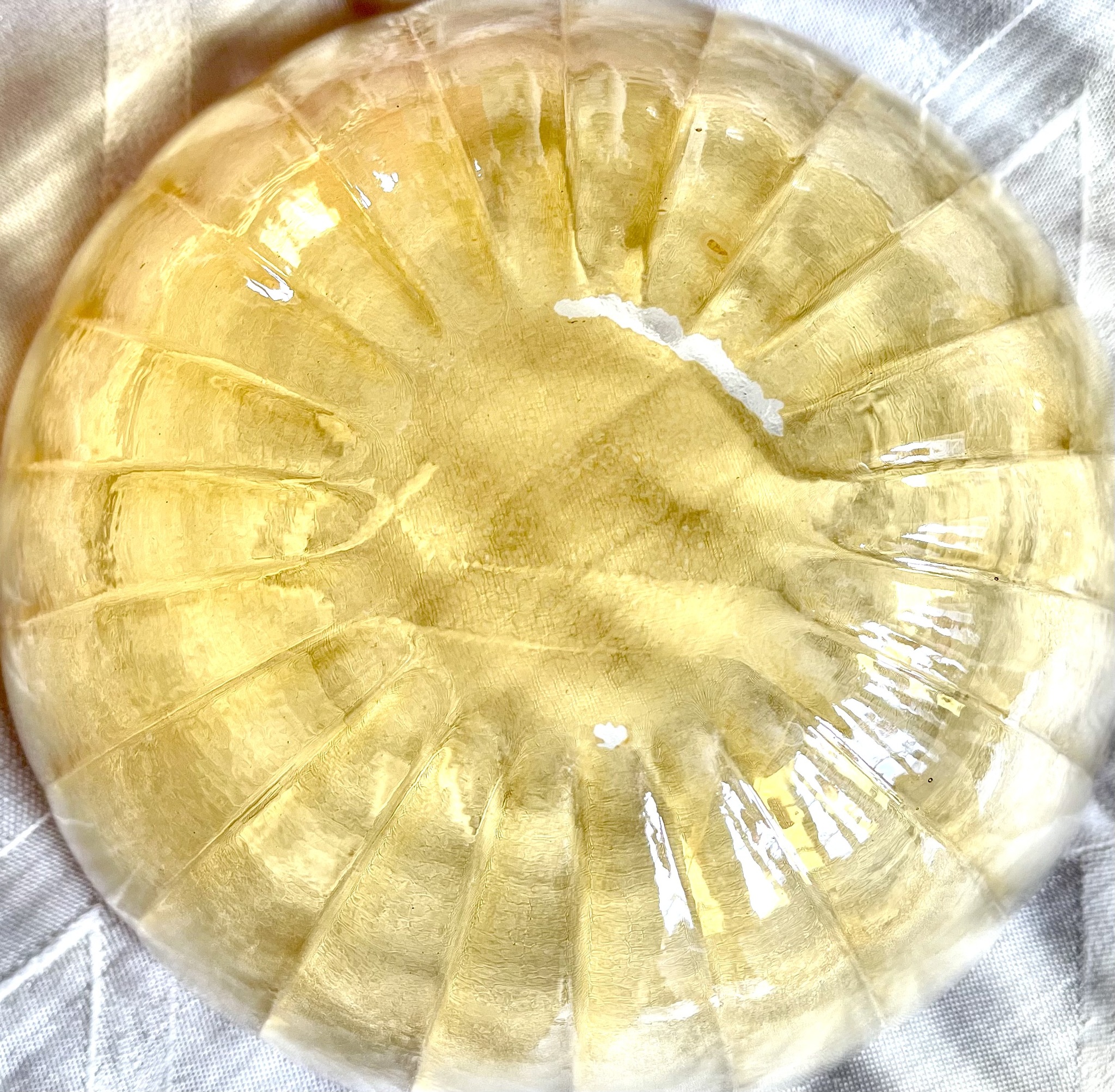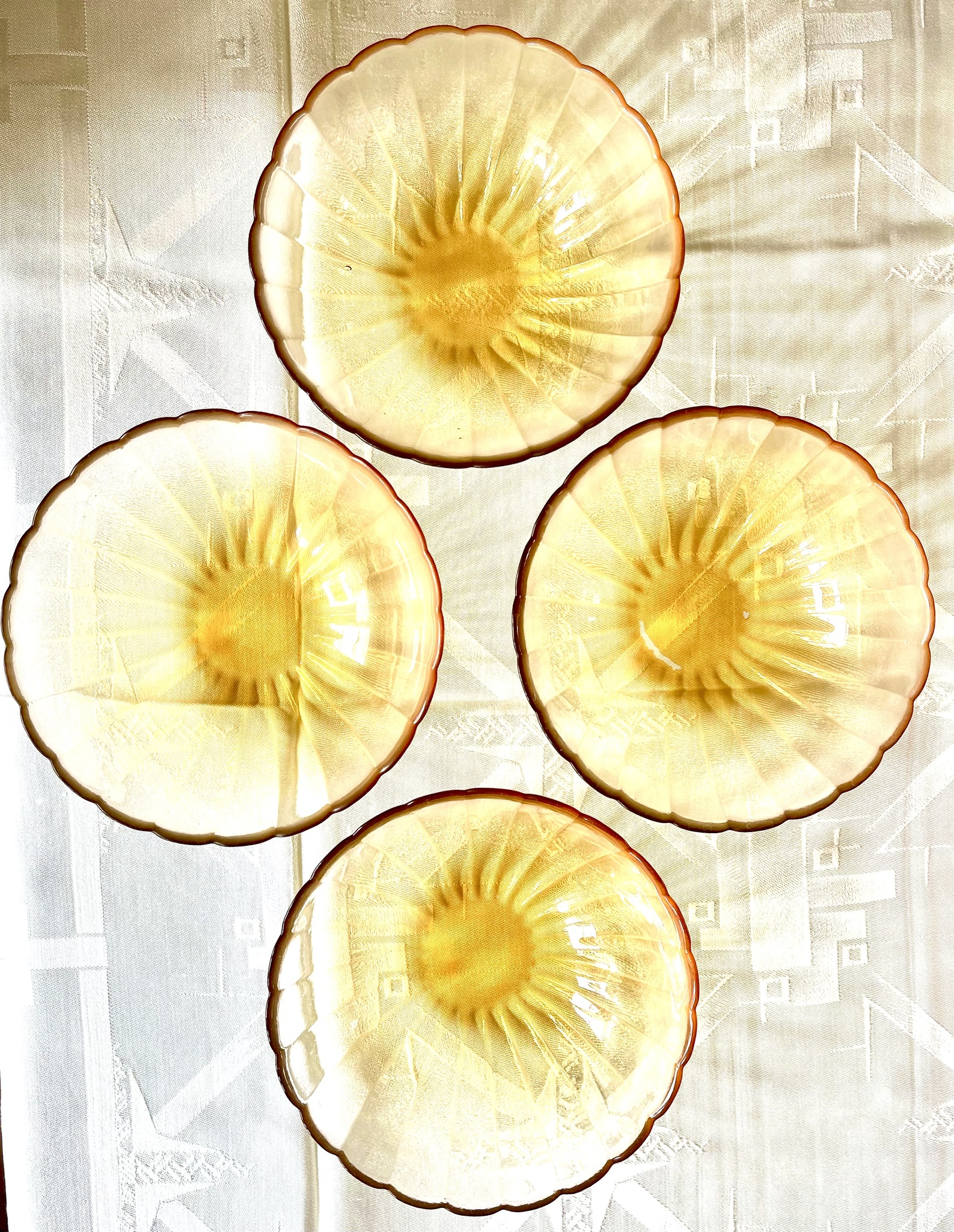 Set med 4 djupa tallrikar av glas med snäckskalsformad kant. Färgen är målad ovanpå glaset, vilket har gjort att färgen i något fall skrapats loss undertill (se bild). I övrigt gott skick. Höjd 5,5 cm