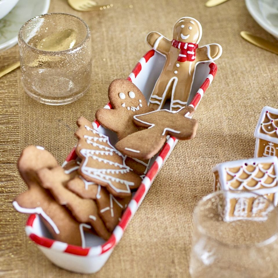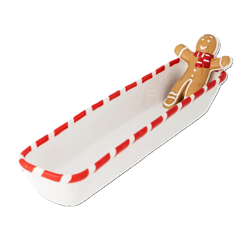 Porslinsskål som inte liknar något annat på julbordet och där en glad pepparkakspojke håller koll på innehållet. Längd 36,5 cm, höjd 9,5 cm, bredd 12,5 cm.