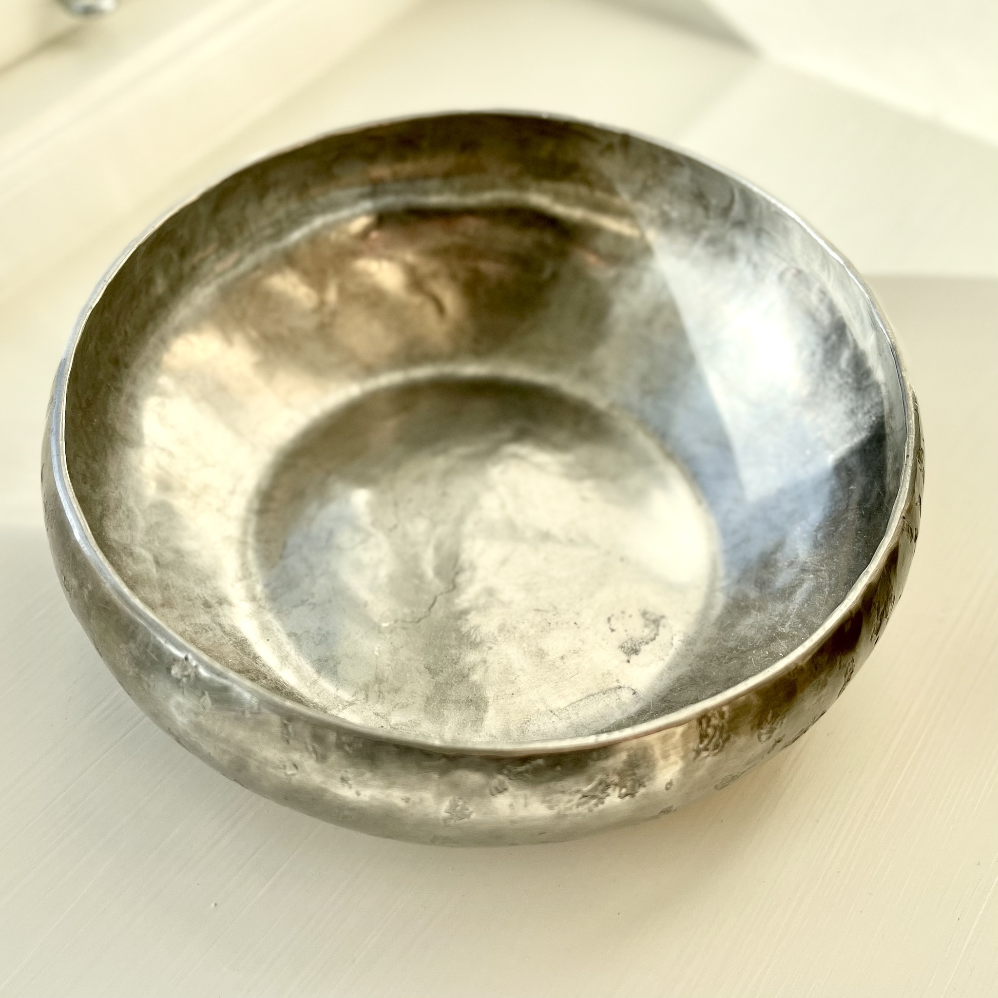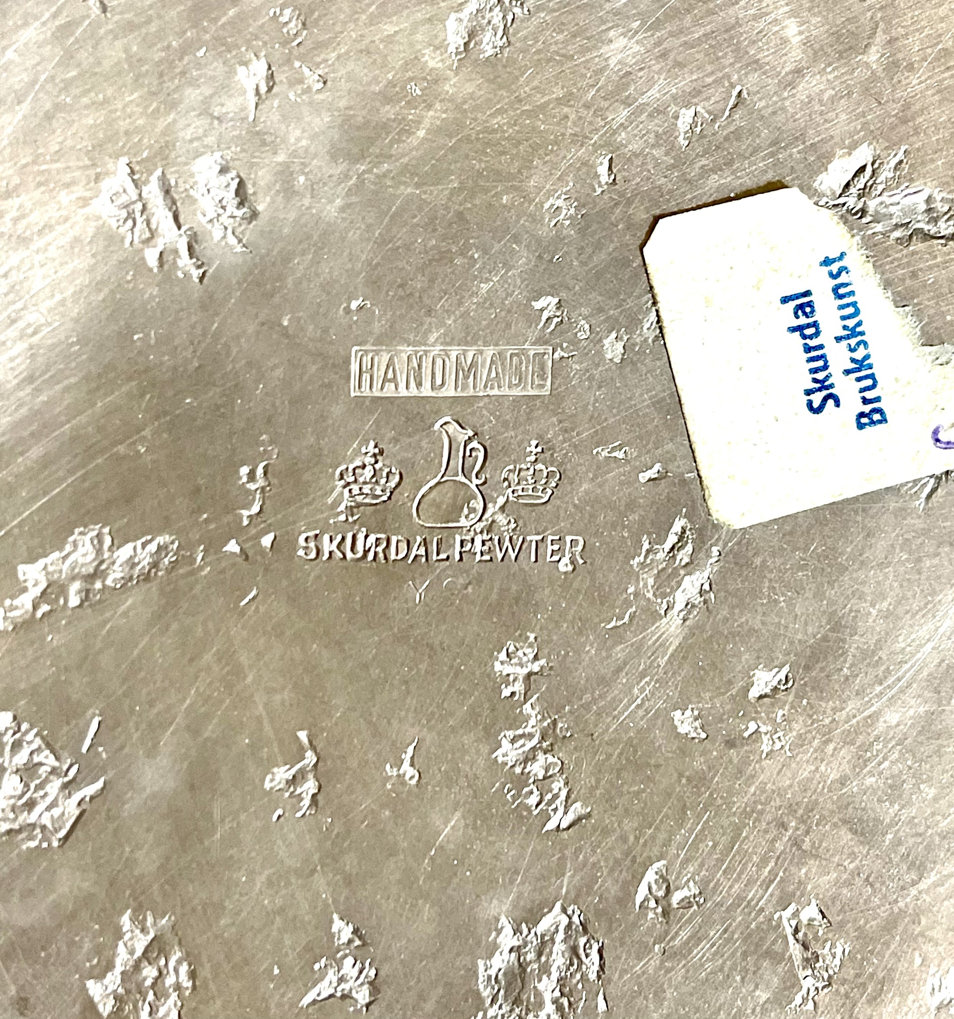 Handgjord skål av tenn från Skurdal Pewter. Obetydligt bruksslitage men oregelbundenheter förekommer i formen. Höjd 6cm, bredd 18cm.