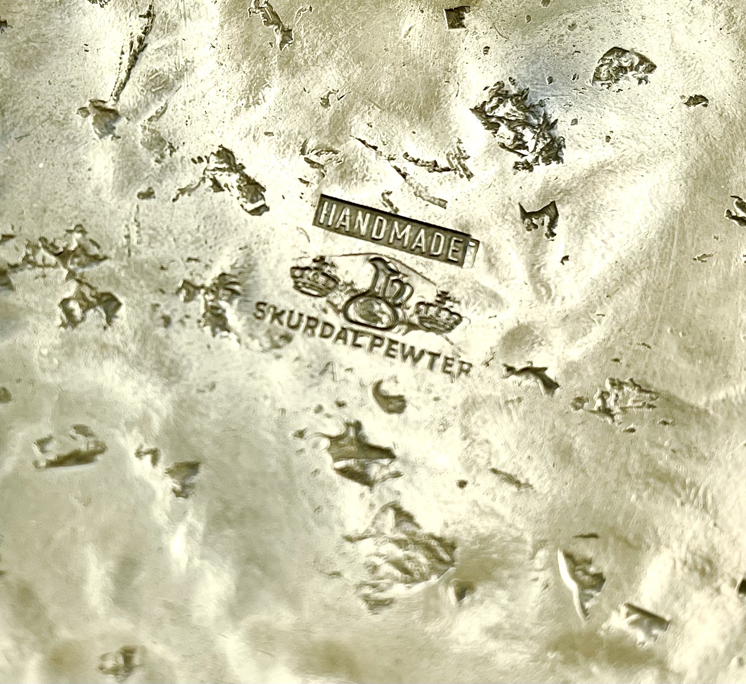 Handgjord skål av tenn från Skurdal Pewter. Ringar som handtag. Obetydligt bruksslitage men oregelbunden i formen. Bredd 25cm, höjd 8,5cm.