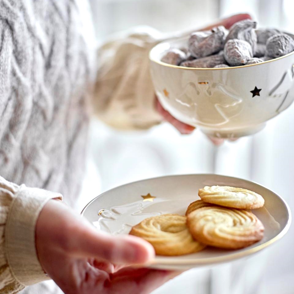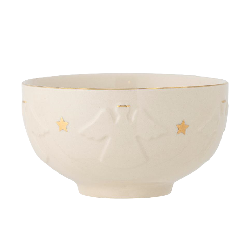 Matcha koppen och assietten i samma serie eller bara njut av den här vintervita skålen av stengods med gulddetaljer och änglar i relief. Handdisk rekommenderas, tål ej micro. Diameter 13,5, höjd 7,5 cm.