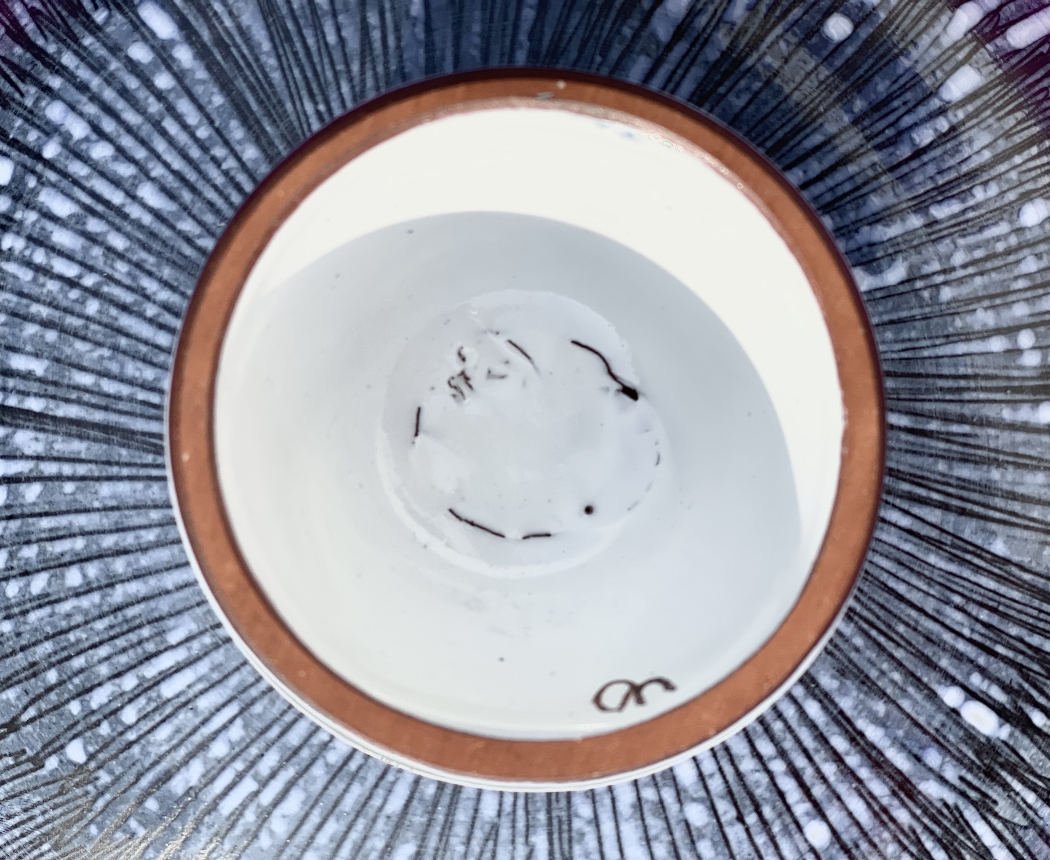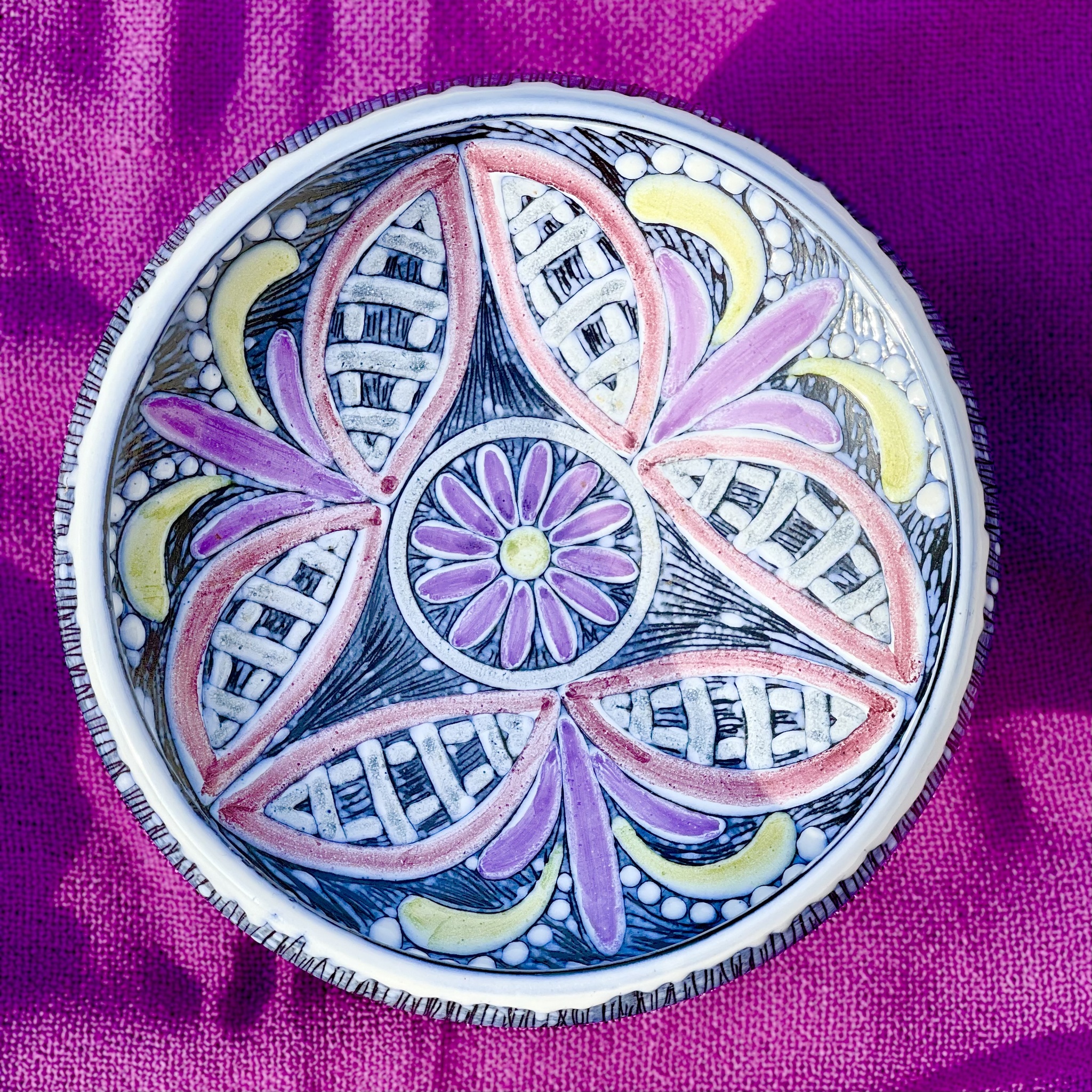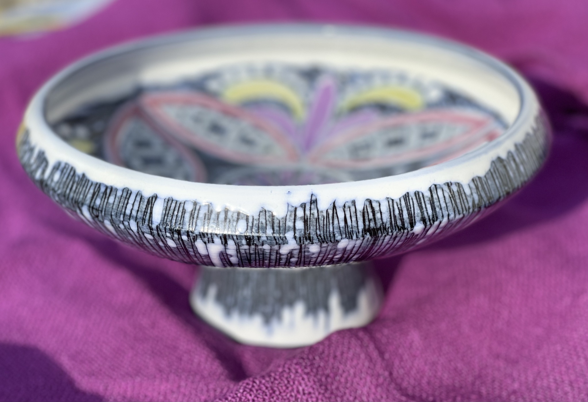 Skål på fot av keramik i tidstypisk 1950-talsdesign. Obetydligt bruksslitage, nyskick. 10 cm hög, 22 cm bred.