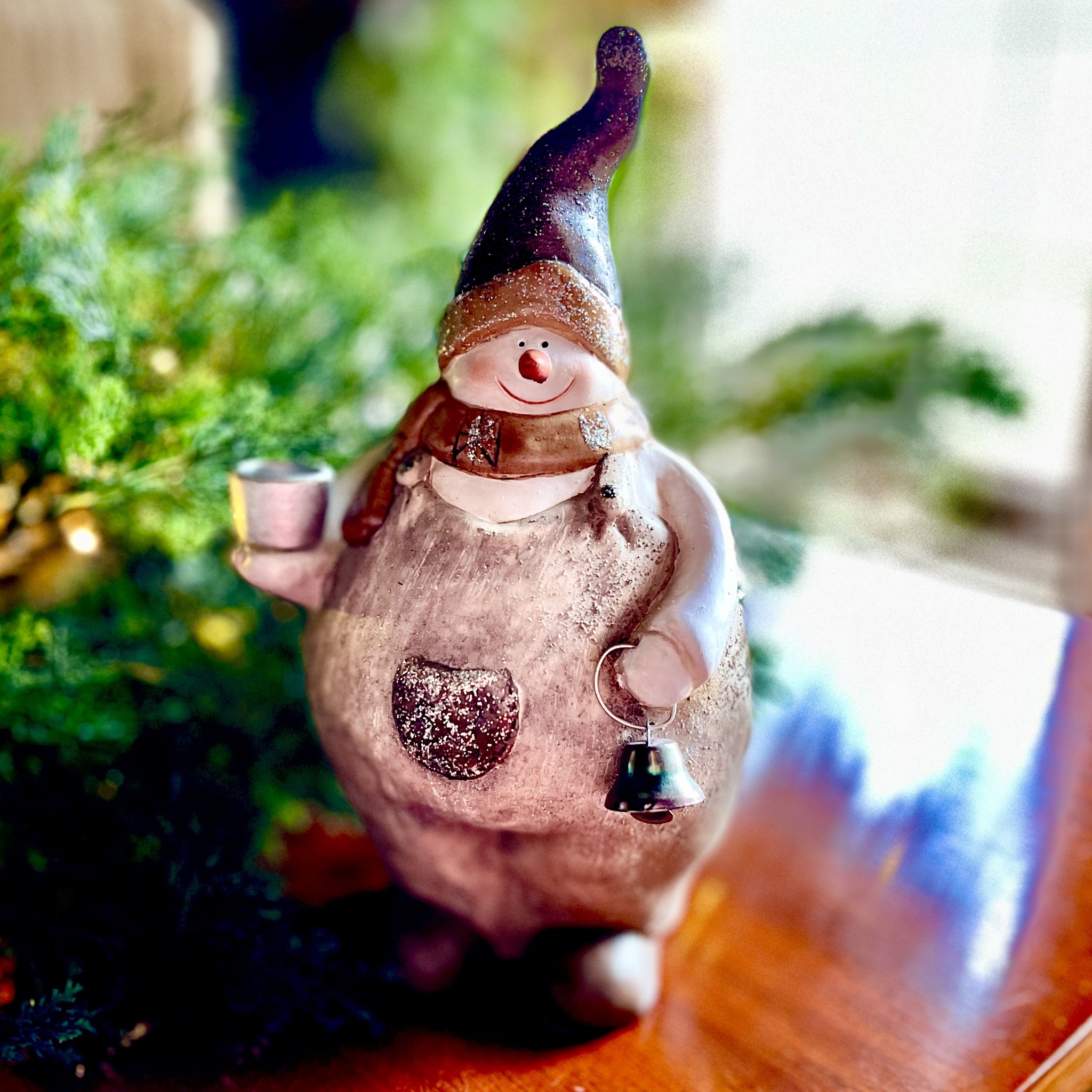 Mullig och mysig snögubbe med ljushållare och liten bjällra. Lite glitter pryder denna söta vinterpojke. Begagnad men i nyskick. Höjd 24 cm.