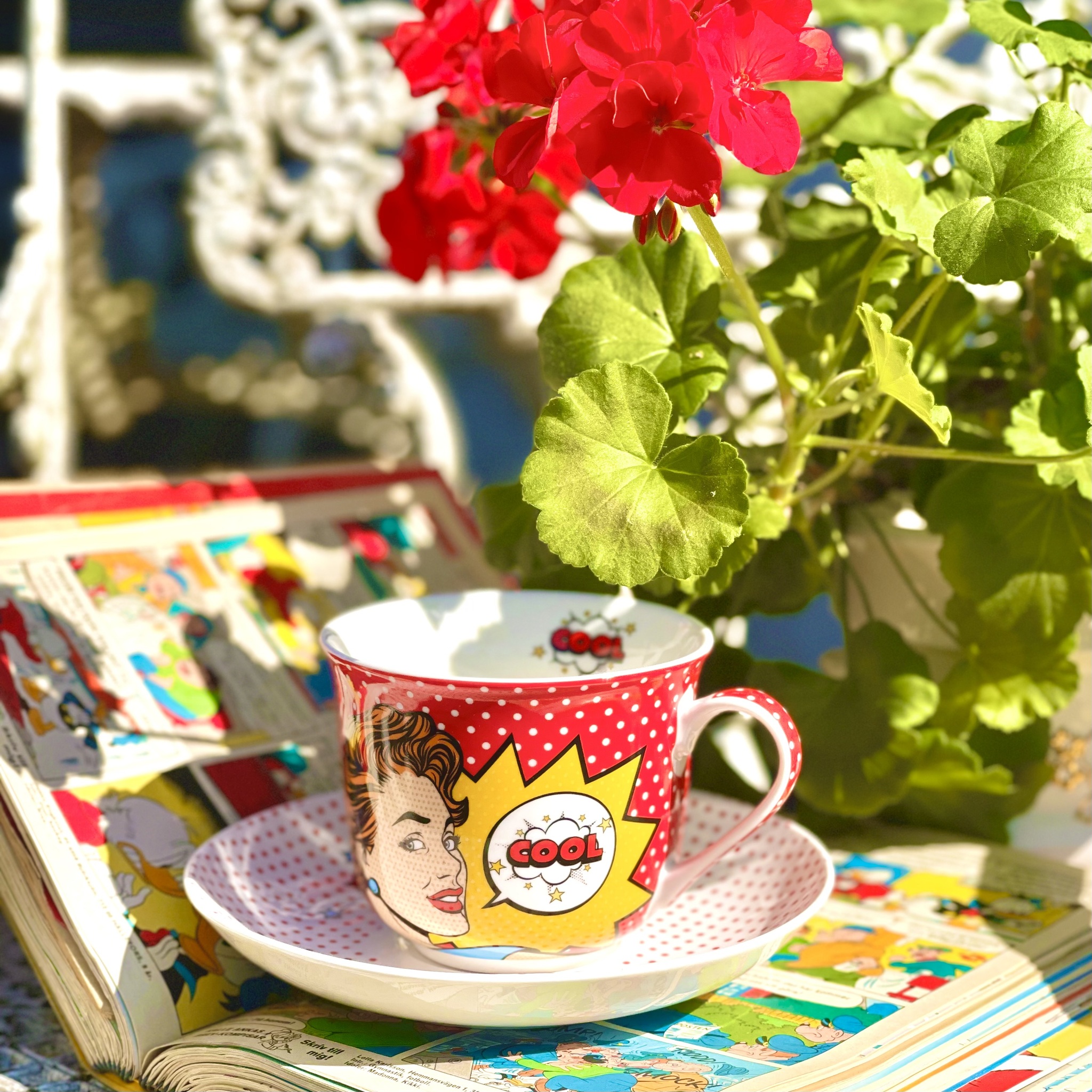 Tekopp med fat i porslin med mönster för den som älskar pop art och serietidningar. Tål maskindisk och micro. Rymmer 400 ml.