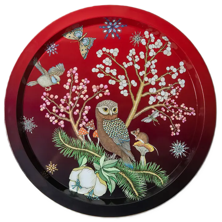 Tennbricka med vintertema designad av Nadja Wedin. Diameter 33 cm.