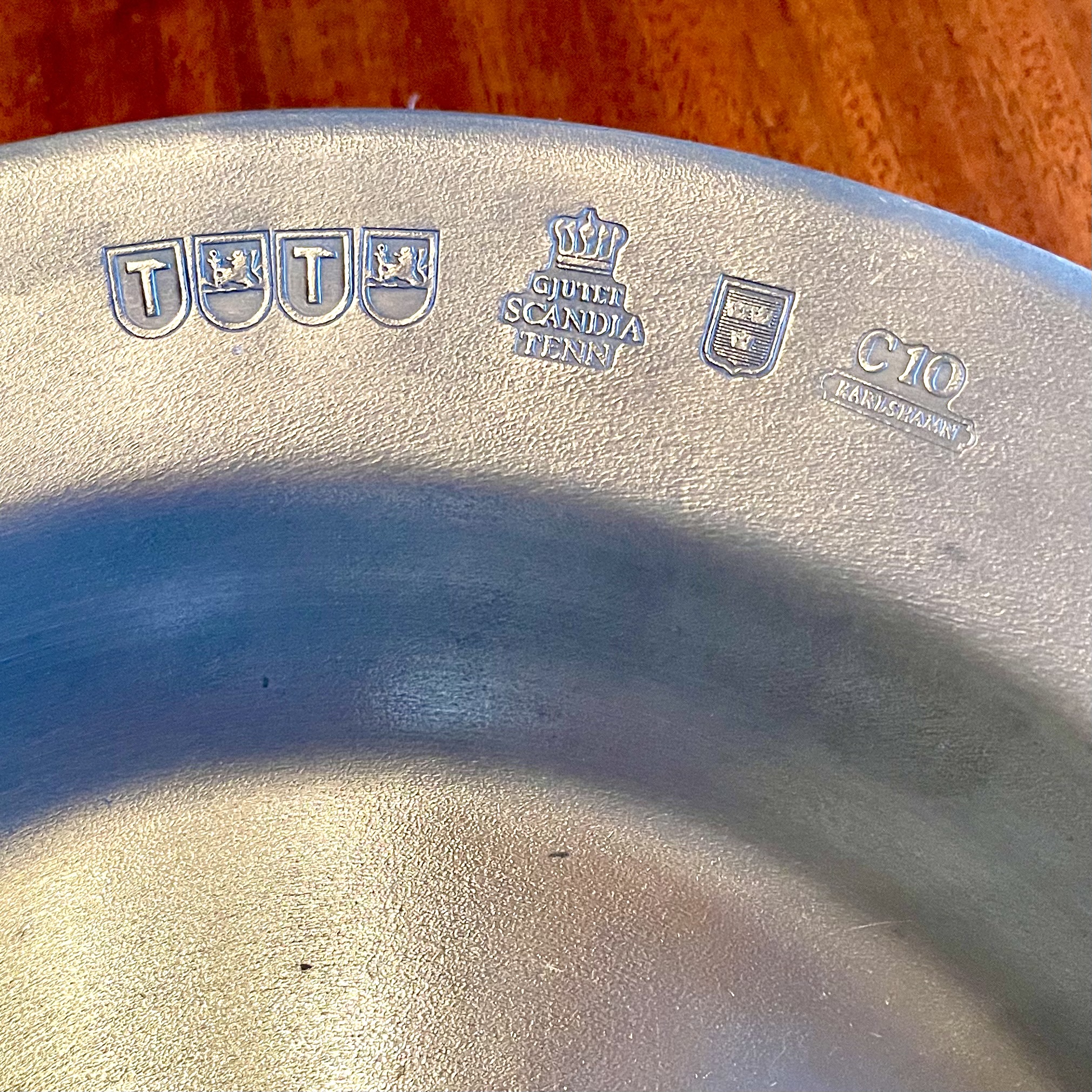 Dekorativt fat av gjutet tenn från Scandia. Stämplat C10 Karlshamn. Bruksslitage och någon repa (se bild). Upphängningsögla (se bild). Diameter 27,5 cm, höjd 4 cm.