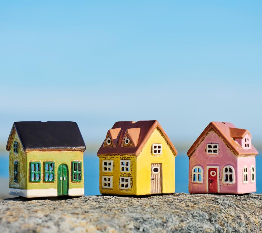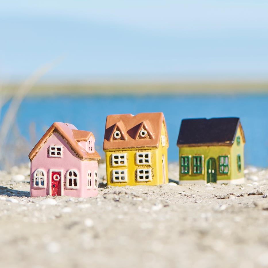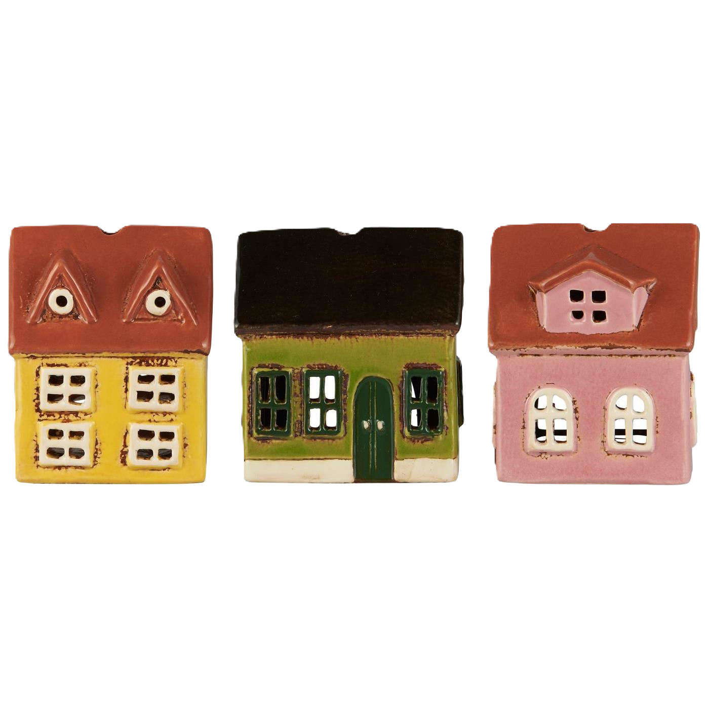 Set med tre små ljuvliga ljuslyktor av stengods, föreställande hus som de ser ut i Nyhavn i Danmark. Husens mått: Bredd 8 cm, höjd 10 cm, längd 8-9 cm.