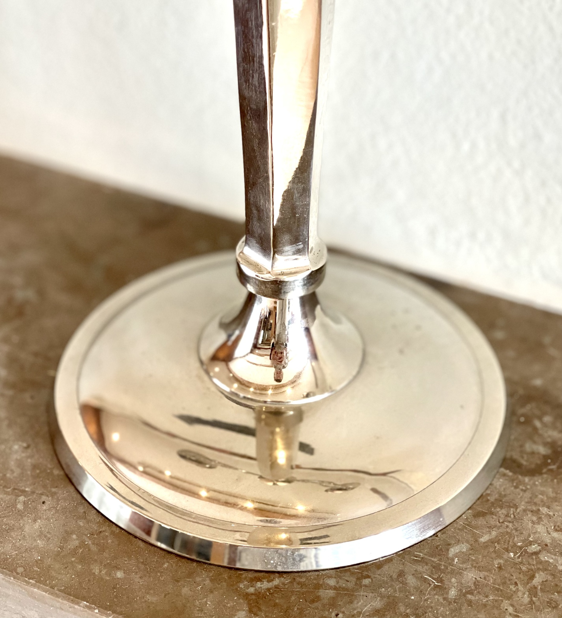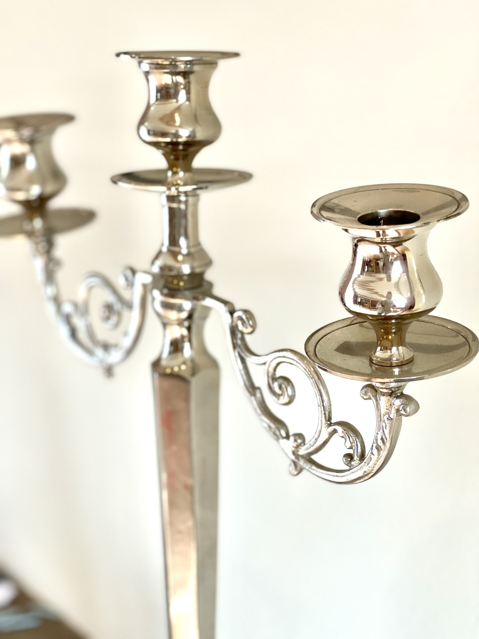 Elegant trearmad kandelaber, silverfärgad tillverkad av nickel. Njut av elegansen samtidigt som du slipper putsa, den håller sig blank och fin i evig tid. Obetydligt bruksslitage. Höjd 44 cm, bredd 34,5 cm, djup 13 cm.