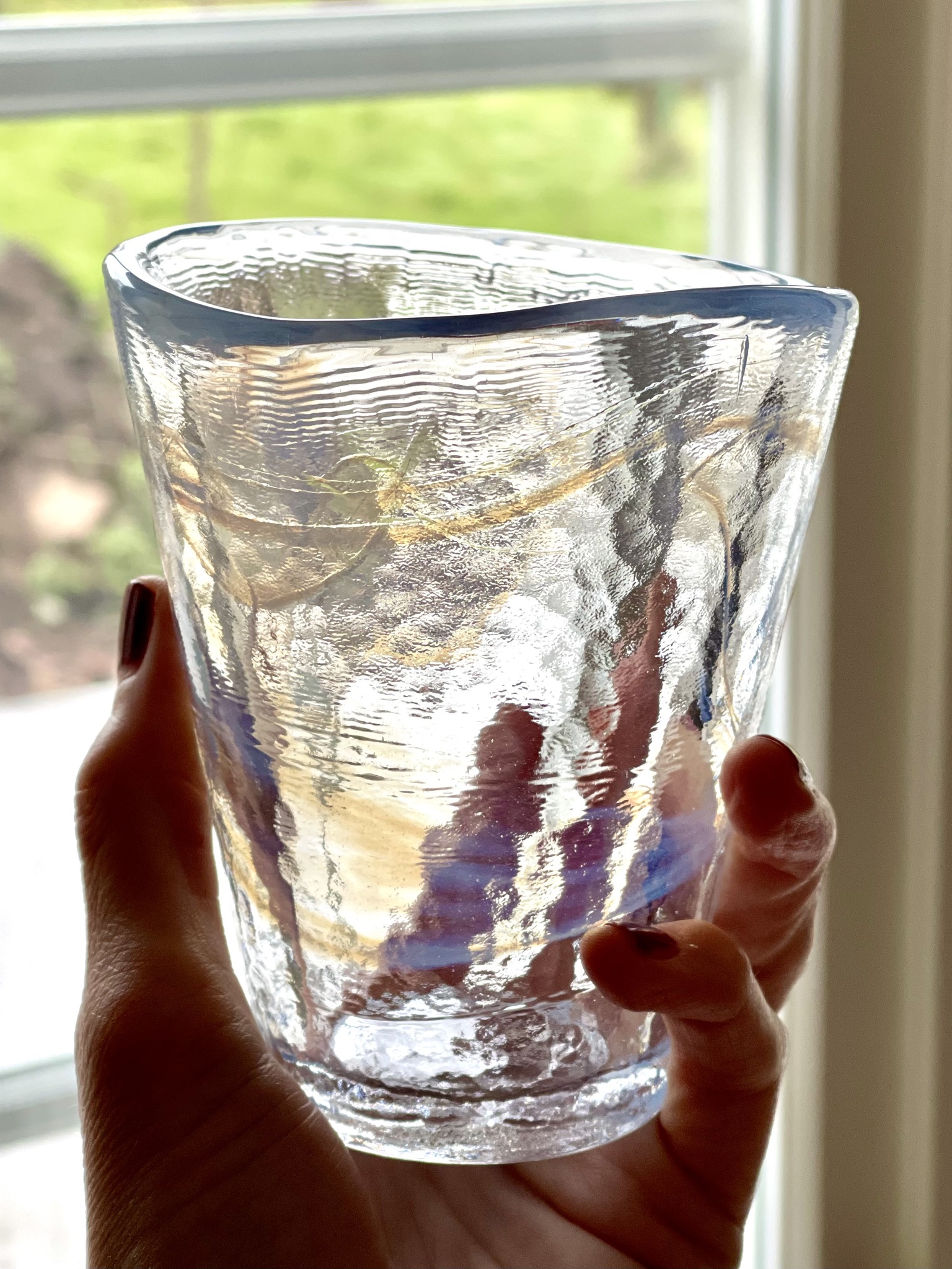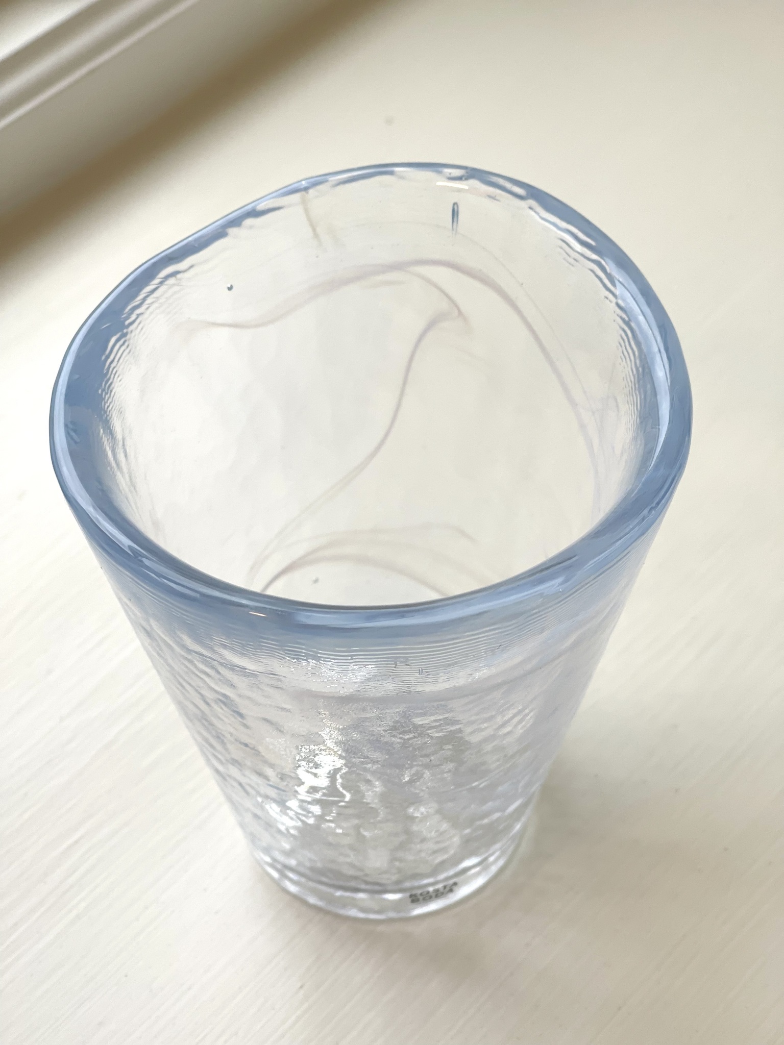 Två stycken tumblerglas ur kollektionen ?Mine? design Ulrika Hydman Vallien för Kosta Boda. Glasen är inte helt klara utan har en vit och ljusblå rökridå i glaset. Se bilder. Handdisk, ej för varma drycker, ej micro. Höjd 11 cm. Nyskick.
