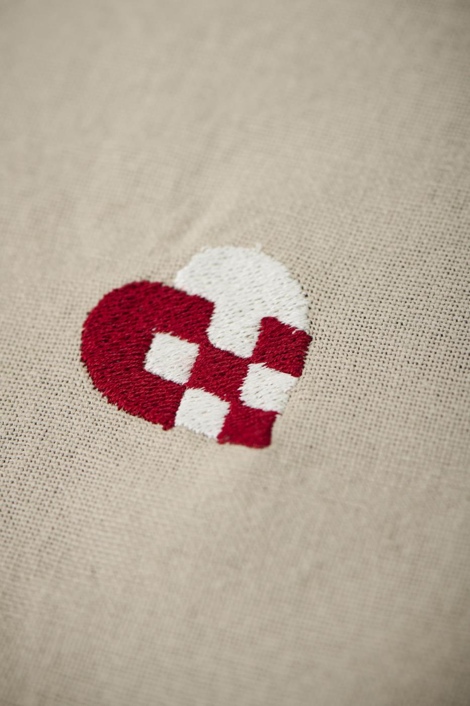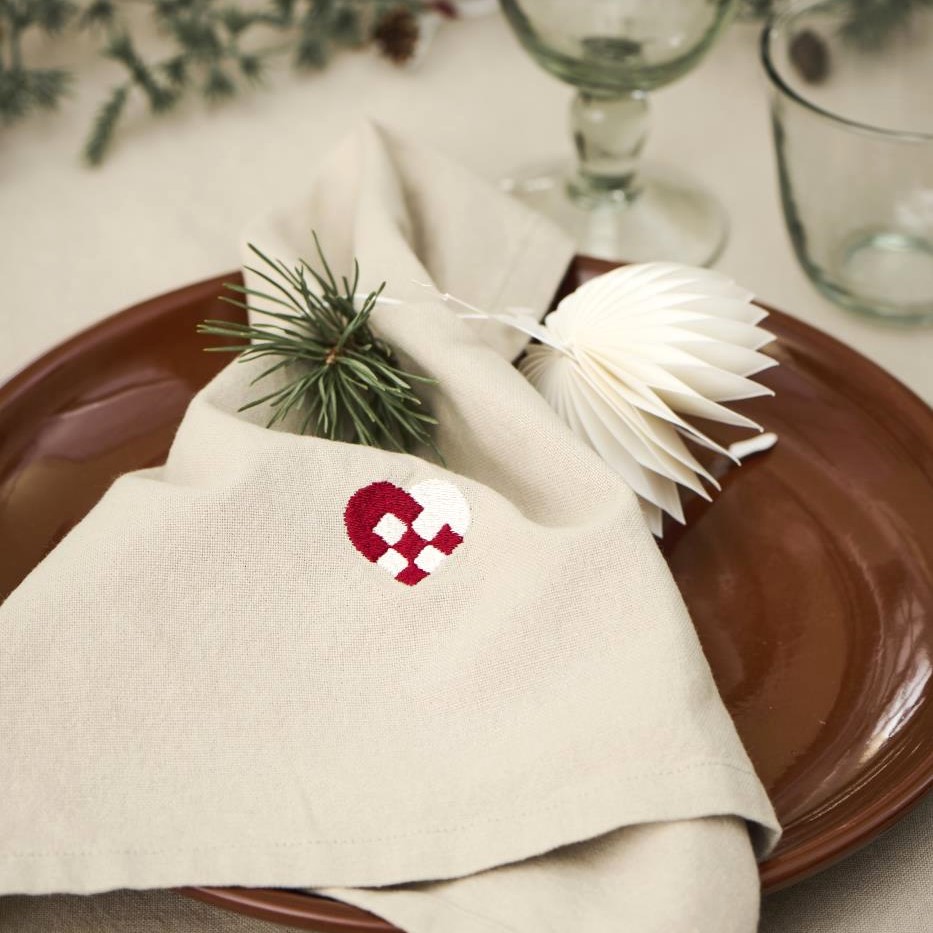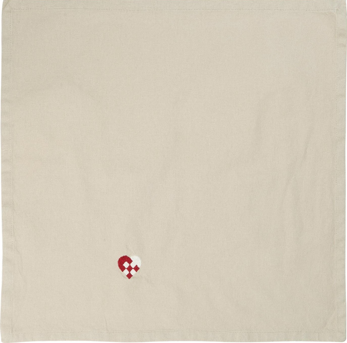 Linnefärgad tygservett med ett broderat hjärta. Klassiskt, stilrent och elegant för din juldukning. Bomull/polyester. Tvätta i 40 grader. Mått 40×40 cm.