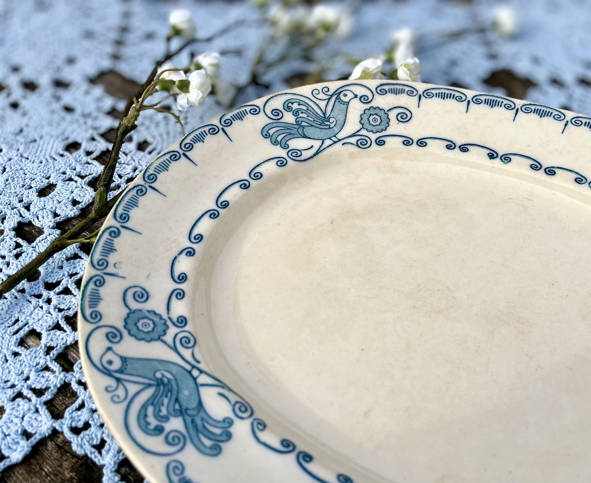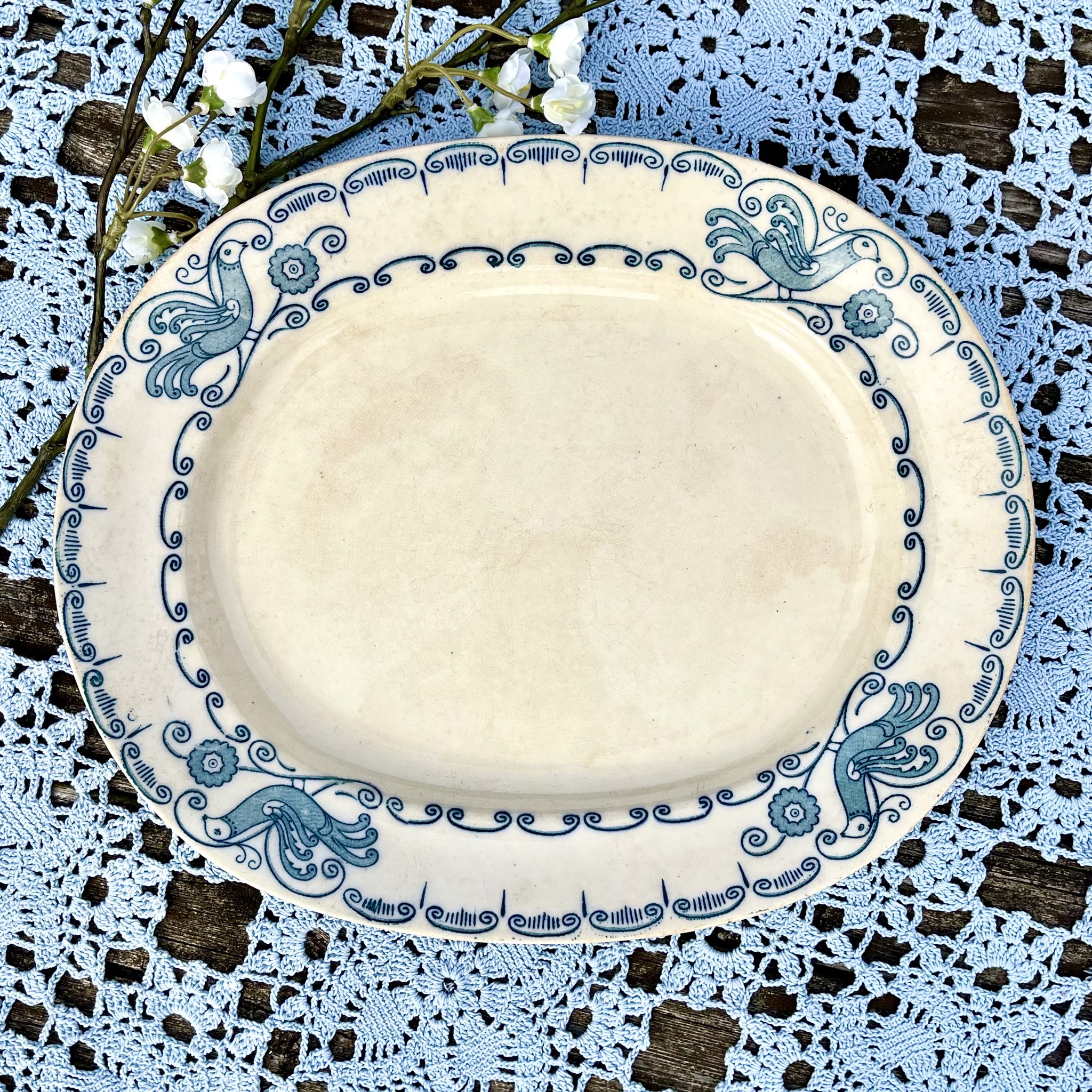 En riktig raritet är uppläggningsfatet från Gustafsberg i serien ?Avis? med sina vackra fåglar och fantasiblommor. Bruksslitage, missfärgningar, krackelyrer och repor men inga nagg. Längd 30 cm, bredd