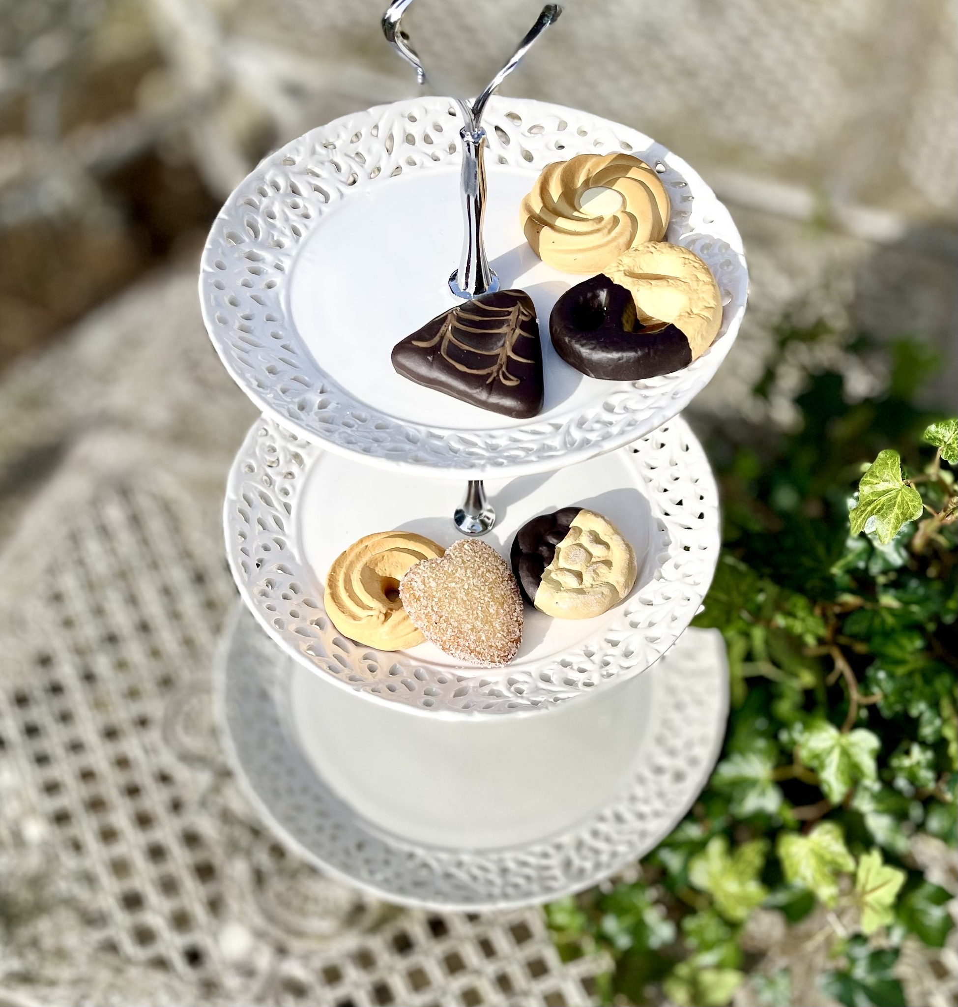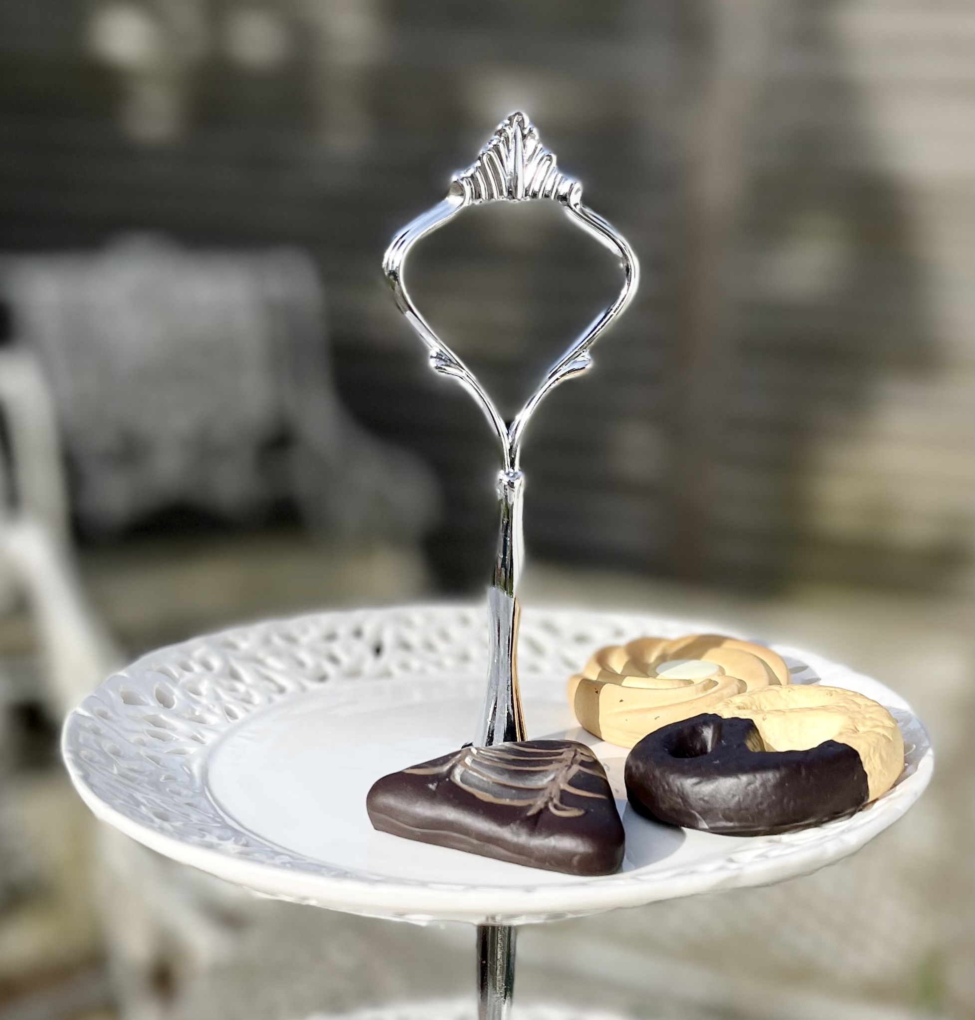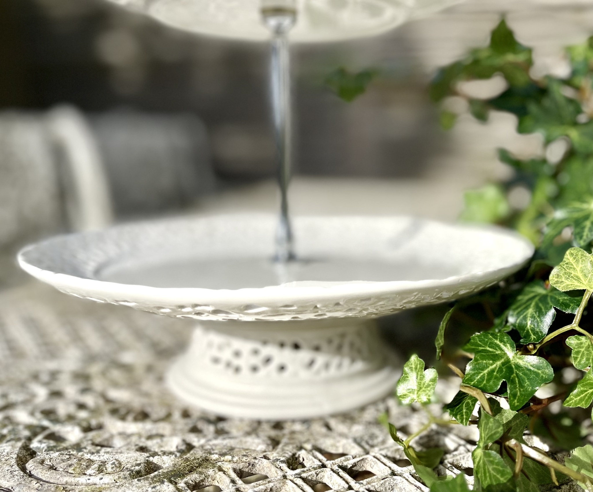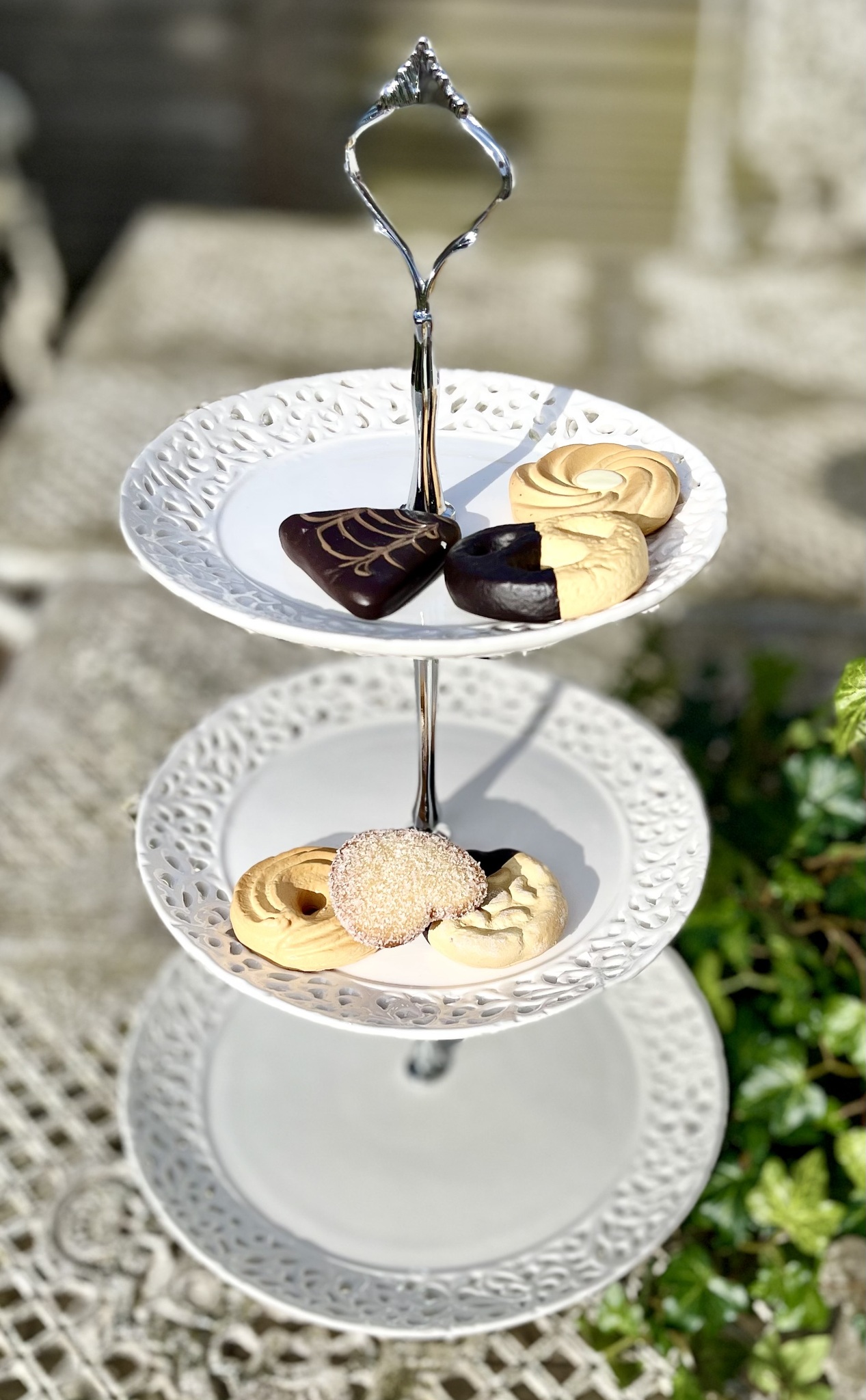 Elegant våningsfat av porslin. Levereras omonterat men skruvas lätt ihop i ett nafs. Höjd 46,5 cm, diameter nedersta fatet 23 cm. Obs! Kakorna får du baka själv. ?