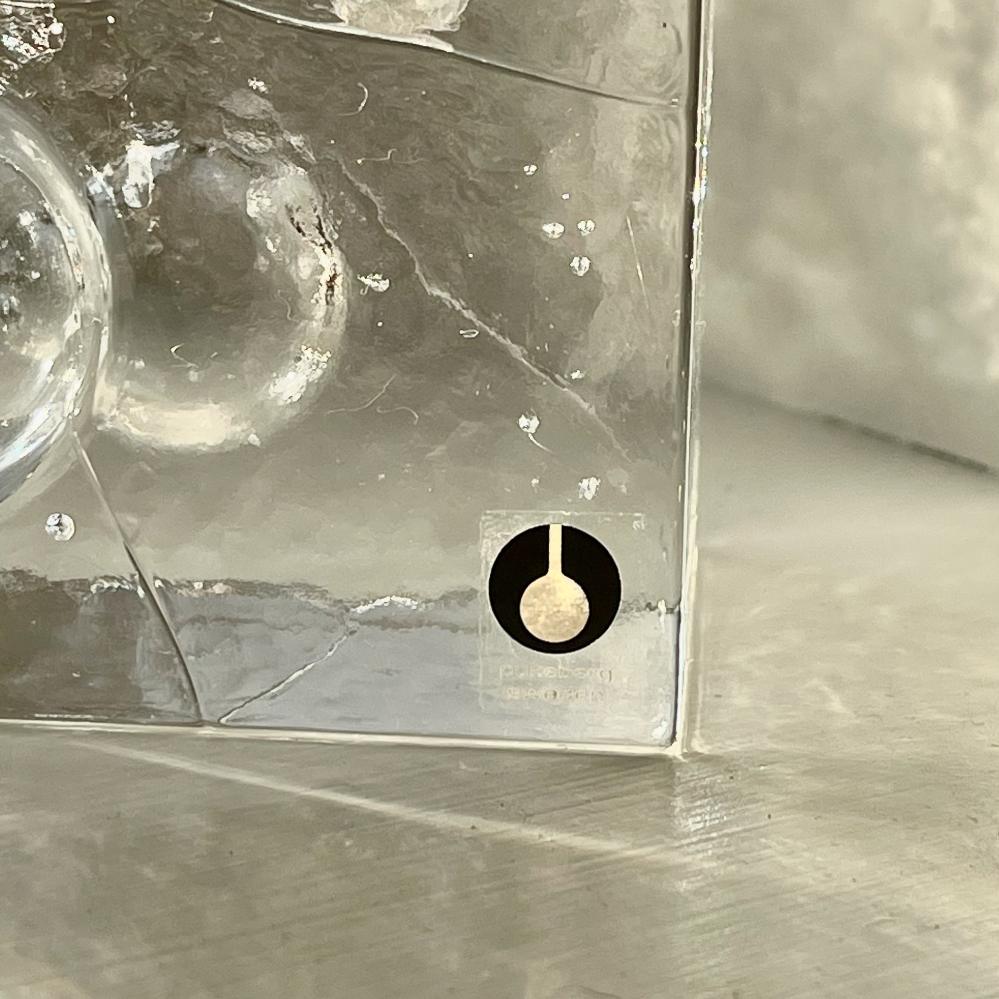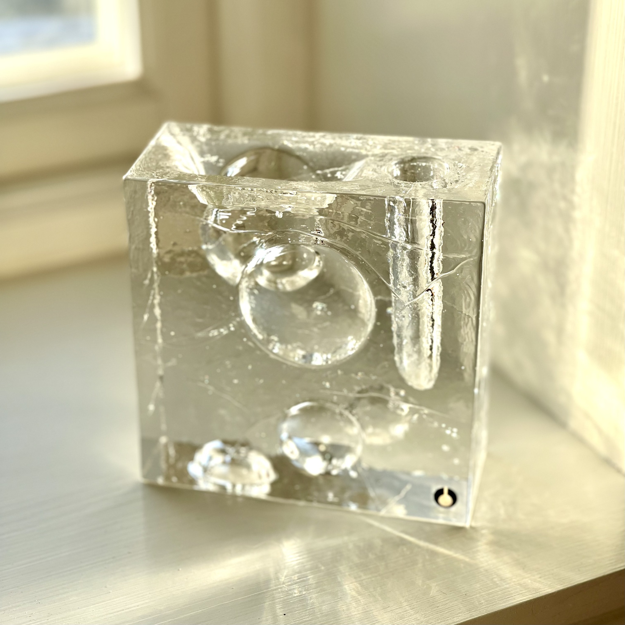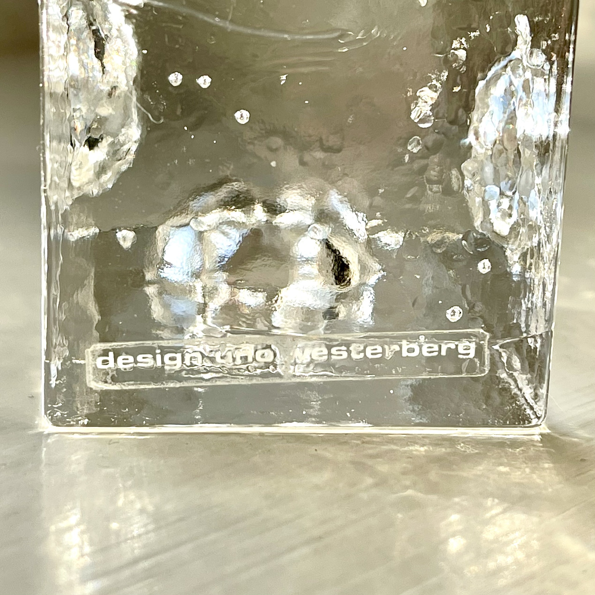 Underbart tokig glaskub med vas för en ensam blomstjälk. Formgiven av Uno Westerberg för Pukeberg, 1960/70-tal. Någon liten synlig kalkavlagring vid vasdelen, i övrigt obetydligt bruksslitage. Höjd 13 cm, bredd 12,5, djup 5 cm.