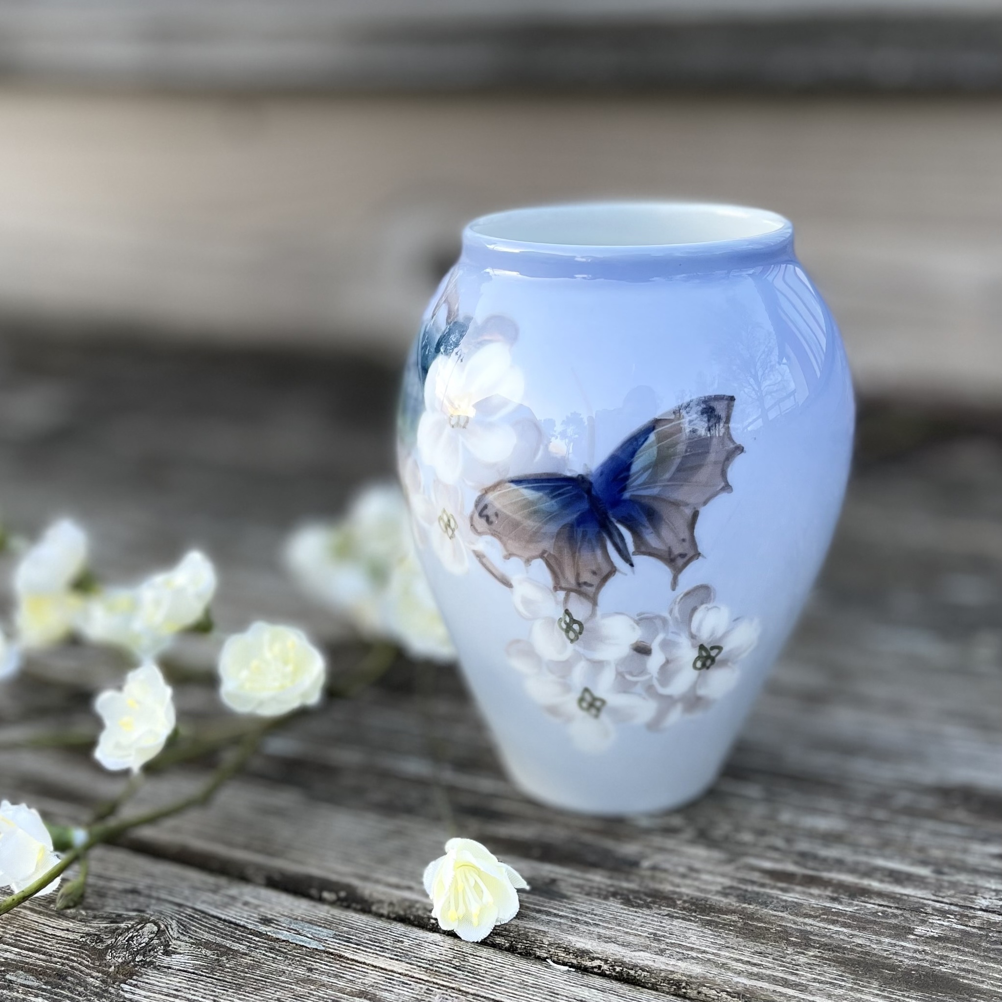 Vas från Royal Copenhagen med dekor av fjäril och blommande kvist. Höjd 11,5 cm. Obetydligt bruksslitage invändigt, nyskick utvändigt.